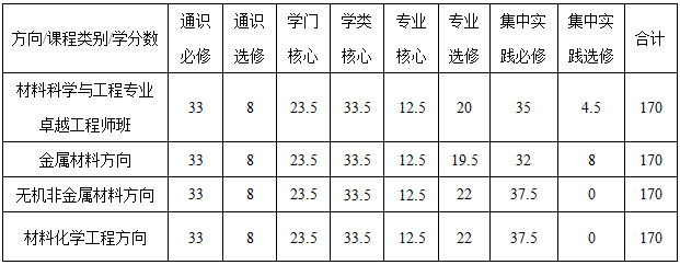 2.材料科学与工程专业学生毕业最低学分数为170学分,其中各类别课程及环节要求学分数表1所示: