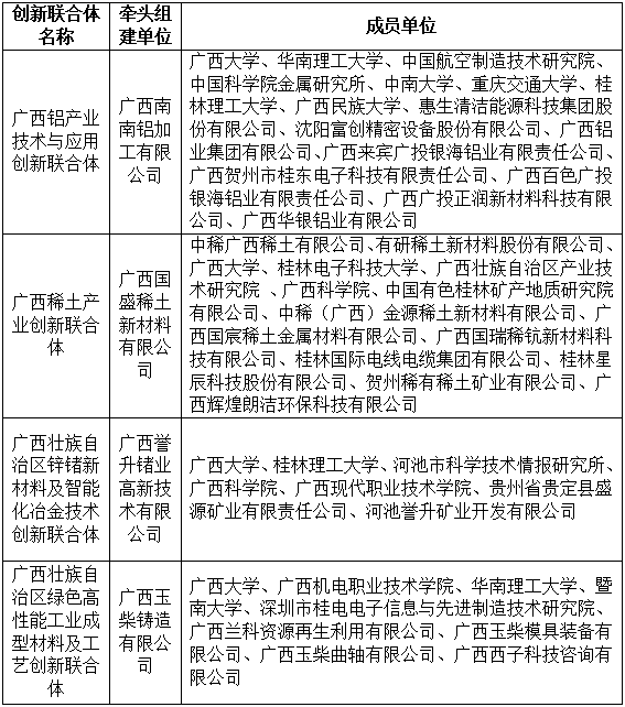 本次获批的联合组建的创新联合体广西大学参与的共6项,其中属于我院科研团队联合的有4项,涵盖铝产业、稀土产业、锌锗新材料及智能化冶金技术、绿色高性能工业成型材料及工艺等多个领域,包括:广西铝产业技术与应用创新联合体、广西稀土产业创新联合体、广西壮族自治区锌锗新材料及智能化冶金技术创新联合体、广西壮族自治区绿色高性能工业成型材料及工艺创新联合体。创新联合体分别由广西南南铝加工有限公司、广西国盛稀土新材料有限公司、广西誉升锗业高新技术有限公司、广西玉柴铸造有限公司四家龙头企业牵头组建,汇聚了广西大学与知名高校、科研机构和众多骨干企业的科研攻关力量。