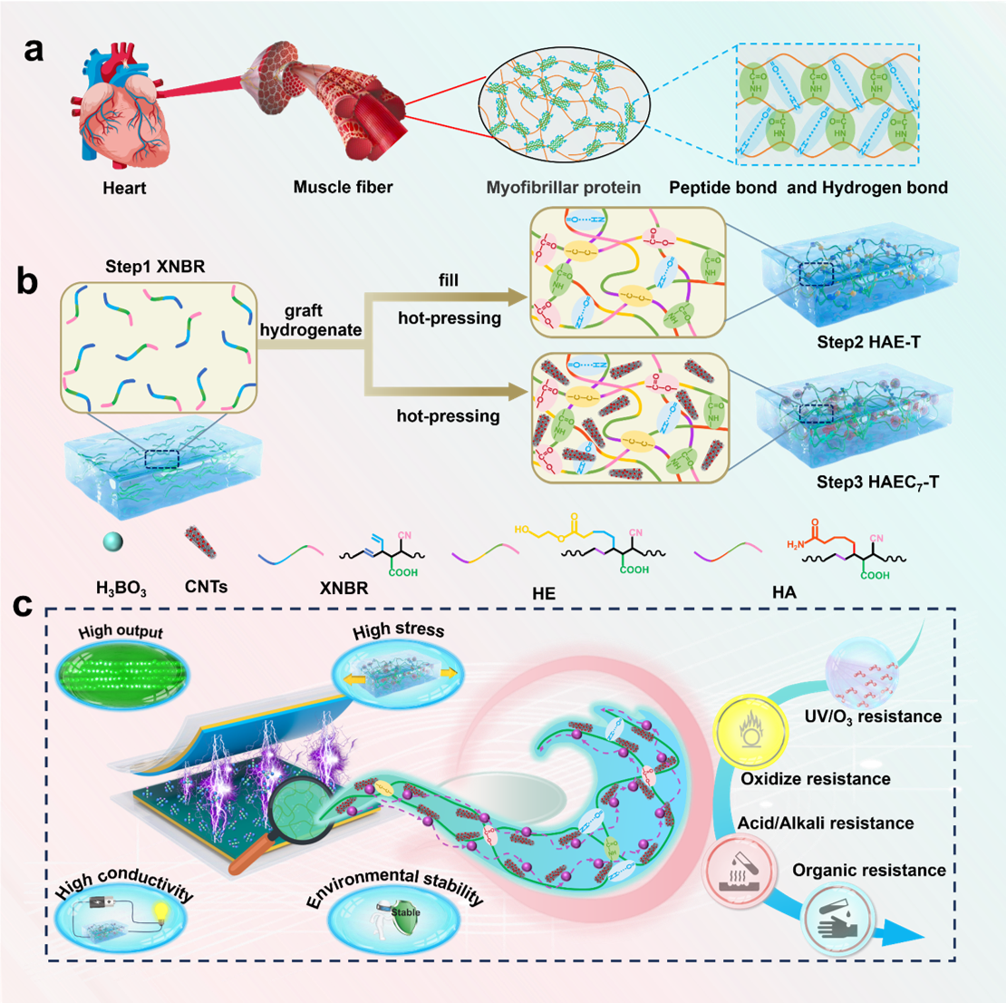 受到肌原纤维蛋白的多重交联网络的启发,课题组以羧基丁腈橡胶(XNBR)为基体,在不使用硫磺硫化的前提条件下,构建由共价交联和非共价交联组成的氢化丁腈橡胶分子网络,制备了具有高氢化度(99%)、多重交联网络的特种橡胶HAE-T,机械强度提升100倍,交联密度提升1444倍。相对于近期报道的橡胶,HAE-T的机械性能处于领先的水平,兼具优异的环境稳定性,可以抵抗紫外光、臭氧、酸碱、有机溶剂的侵蚀。基于此,引入CNT构造均匀且连续的导电网络,制备成特种导电橡胶HAEC7-T,并将其制备为摩擦纳米发电机RECE-TENG。RECE-TENG在恶劣环境中仍然可以表现出稳定且优异的摩擦电输出性能。本研究为高性能橡胶基电子导电弹性体的制备开辟了新的途径,为制备出高输出性能且在恶劣条件下稳定工作的TENG提供了新的思路,有利于能源的收集与应用,促进了能源的可持续发展。